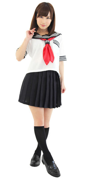 涼しげな夏服仕様の半袖タイプ!セーラー襟や袖のオーソドックスな3本ラインでリアル感も演出!ミニ丈のプリーツスカートがちょっぴりセクシーなスクール系コスチュームです。