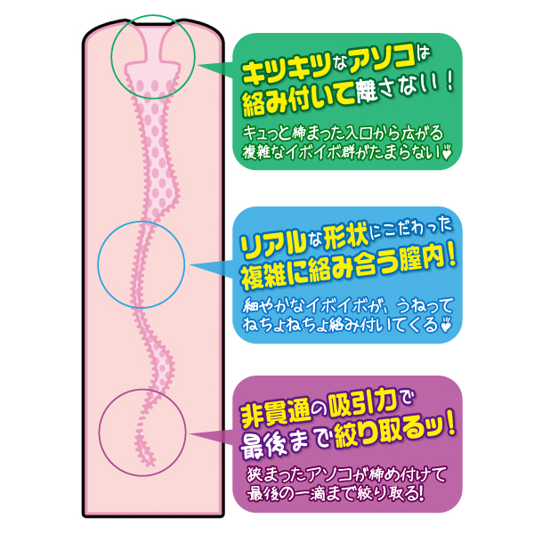 伸縮自在で柔らかく、耐久性も抜群のエラストマー素材を使用!キュッと締まった入り口の奥は、複雑なイボイボ群のたまらない刺激!最奥はさらにキツく締まっており、非貫通型ならではの吸引力で一滴残らず搾り取ってくれます。
