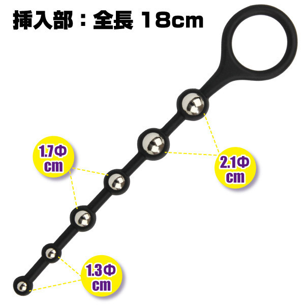 大・中・小が2つずつ連なったメタルボールを、ソフトなシリコン素材で包んだ、異素材同士のコラボによる斬新な快感!もち手リング付きで使いやすく、長めのボディで奥までラクラク!アナル上級者も大満足の使い心地が得られるアナルグッズです。