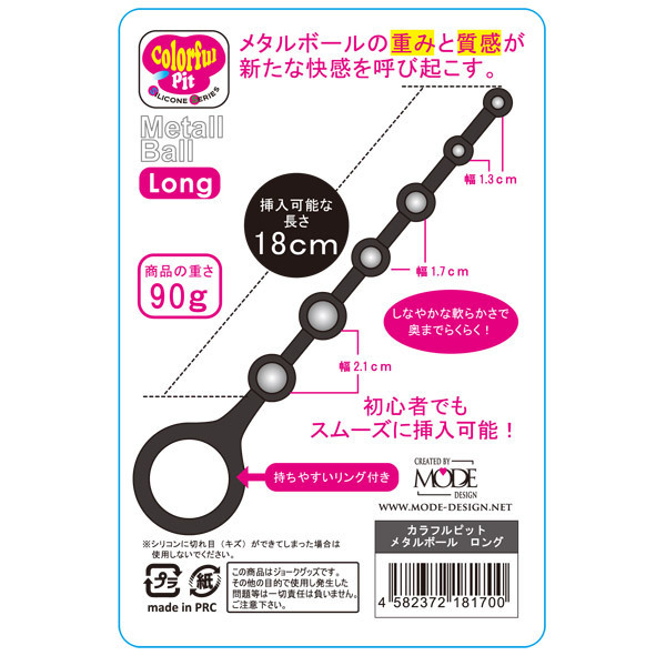 - 仕様パッケージ:17.1×12.0×5.0cm 本体:24.5×1.3〜2.1φcm(挿入可能な長さ18.0cm) 重量:90g メタル特有のヒンヤリ感を堪能出来るアナルグッズ「カラフルピット メタルボール ロング」。