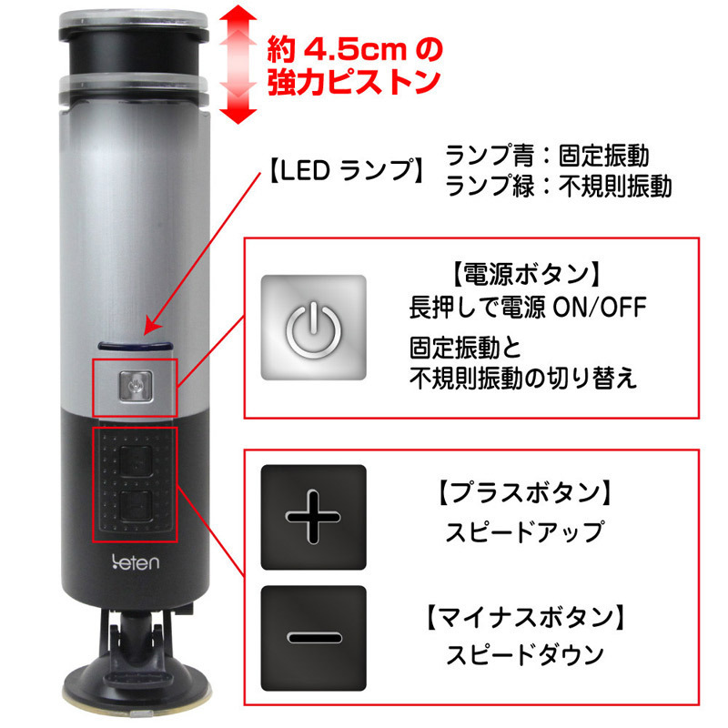 - 仕様パッケージ:28.8×15.7×7.7cm 本体:全長25.0cm 重量:472g USB充電式 人気ブランド「Leten」商品がついに日本上陸!第一弾は男性用のUSB充電式電動オナホールです。