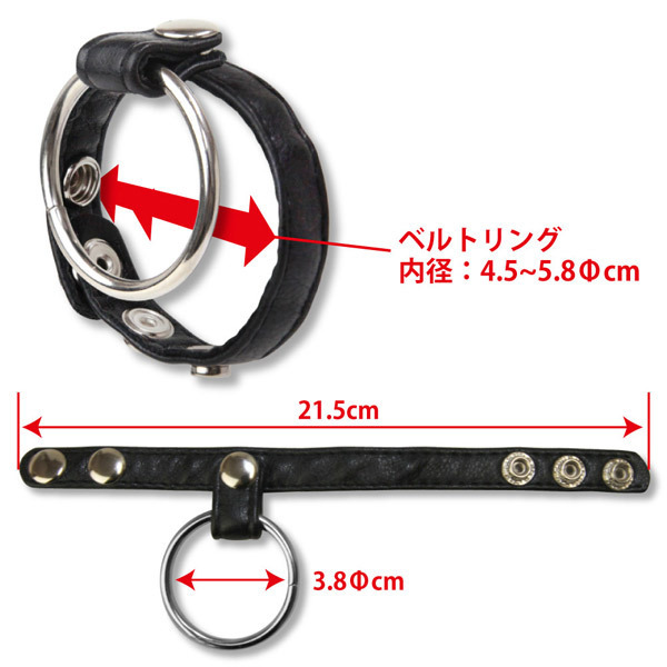 ●高級感のあるフェイクレザー使用●メタルリングとのダブル締め付け●ベルト部分はスナップボタン採用●内径45〜58mmまでサイズ調節可能●早漏を防いで射精力・男性力UP。