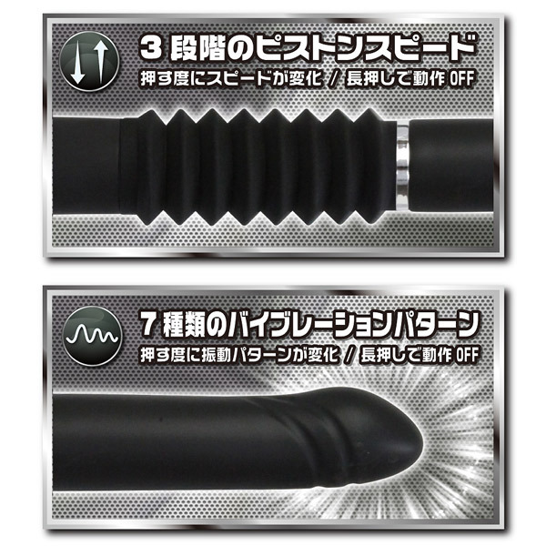 3段階のピストンスピードと7種類のバイブレーションを搭載!可動幅6cmの大迫力ピストンでポルチオに直撃しまくり、先端部分に搭載された強力モーターで快感振動が奥まで響き渡ります。