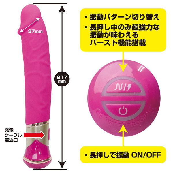 リアルなペニス型のストレートボディは亀頭部分に強力なモーターを内蔵!10パターンの振動+スイング機能に加え、ボタンを押している間は生き物のように激しく暴れるファンキーバースト機能が発生。