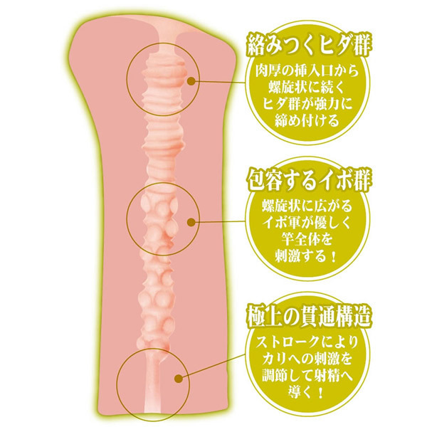 肉厚の入り口から螺旋状に続くヒダ群が肉棒全体を締め付けて刺激!その後、ヒダで刺激された肉棒を螺旋状に広がるイボ群が優しく包み込みます。