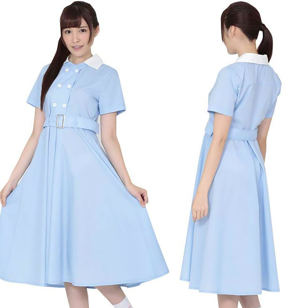 清楚なパステルブルーのカラーに白襟が、上品な印象と少女らしさを兼ね備えた可愛らしさを演出してくれます!ワンピースタイプでふんわりと広がるガーリーなスカートは、自然なスリットも入っていて学生気分に浸りたいときにもオススメ。