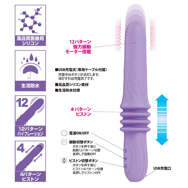 素材には肌触り滑らかなメディカルシリコンを使用!先端に内蔵された強力モーターと激しく動くピストンで身体の奥深くへ快感を届けます♪コチラはUSB充電式で、およそ120分の充電で60分の稼働が可能。