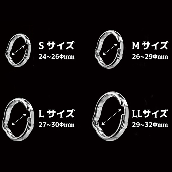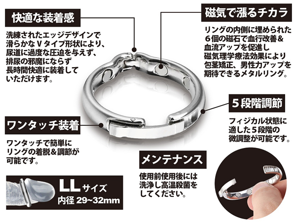 包茎や持久力でお悩みの男性にうってつけ!内径2.9〜3.2cmのリングが包皮を亀頭部分でまとめつつ、リング内側の磁石で血流を促すことで力強く逞しい男根へと導きます♪身体の状態に適した5段階のサイズ調整や装着もワンタッチで楽々!使用後は煮沸消毒で殺菌することで、常に清潔な状態でお使いいただけます。
