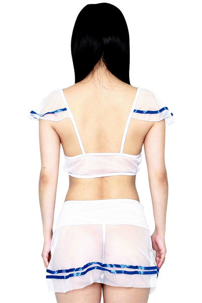 - 仕様Mサイズ:B78〜88cm・W58〜70cm・H87〜95cm パッケージ:31.0×21.5×2.5cm セット内容:シースルートップス、シースルースカート、Tバックショーツ 素材:ナイロン36%、ポリエステル74% セーラー服とランジェリーが組み合わさったような透け感たっぷりのコスプレ衣装♪シースルー生地に鮮やかな青いラインを2本、胸元をふんわりとした白のリボンで装飾した可愛らしいデザインとなっています♪