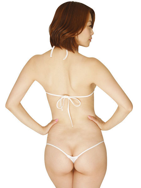 こちらは定番カラーのホワイトで男性ウケも抜群!小さな三角形のブラと、ほとんど隠せていないショーツがなんともセクシーですね。
