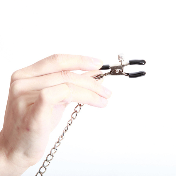 口枷から伸びたチェーンは40cmの長さがあり、先端のクリップにはゴムカバーが付いているので跡が残りづらく、締付けの強弱も調整出来ます♪