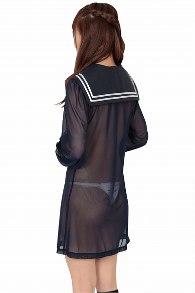 - 仕様Mサイズ B78〜88cm・W58〜70cm・H87〜95cm セット内容:ワンピースセーラー、スカーフ 素材:ポリエステル、その他 素肌ががっつり見えちゃうスケスケ仕様!シースルー生地で仕立てた紺のセーラーワンピース。