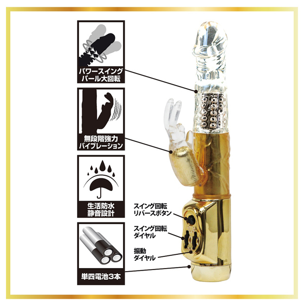 - 仕様パッケージ:22.0×7.5×4.5cm 本体:21.5×3.0cm 電池:単四電池×3本使用 高級感のある見た目と強力スウィング&振動に圧倒される!クリスタル×ゴールドの子機付きバイブ。