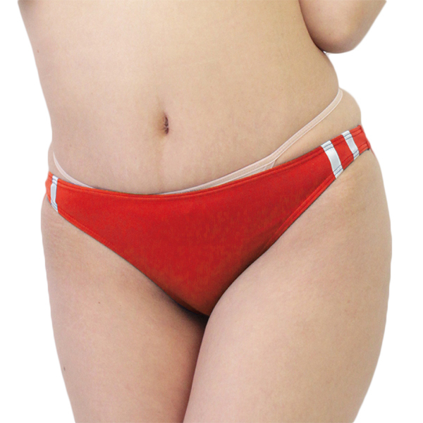 - 仕様Mサイズ パッケージ:16.0×13.0cm 日本製 伸縮性のあるストレッチ生地を使用したブルマ風ハーフバック(赤)。
