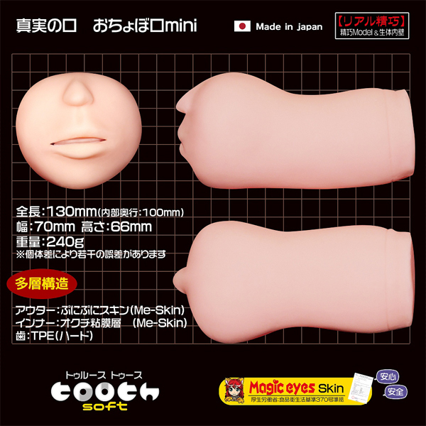- 仕様非貫通型 パッケージ:18.0×9.9×7.0cm 本体:13.0×7.0cm 重量:240g 日本製 ふわっと柔らかい!元祖「真実の口」よりミニサイズが登場!未経験のような優しさと下手くそさを再現した日本製の非貫通オナホ♪手に馴染みやすいハンドサイズで喉の奥行は10cmと短め。