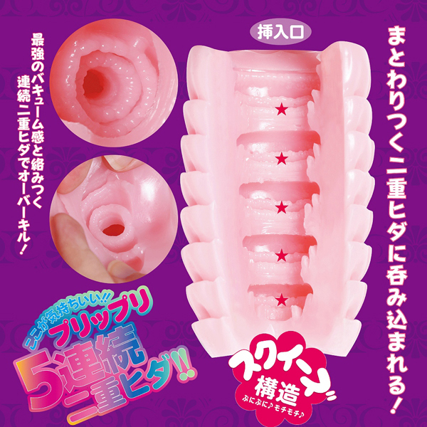 - 仕様非貫通型 パッケージ:20.5×13.5×7.5cm 本体:13.0×7.0×7.0cm 重量:370g もっちり柔らかな二重ヒダが5連続で刺激する日本製の非貫通オナホ。