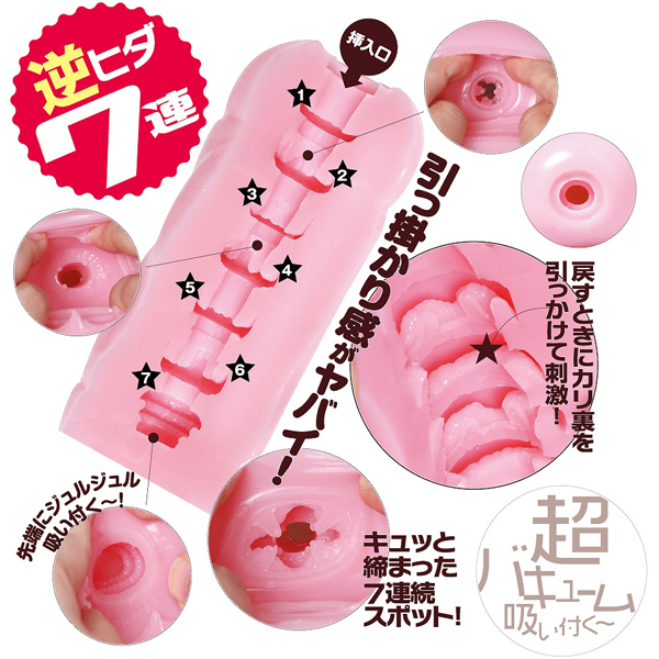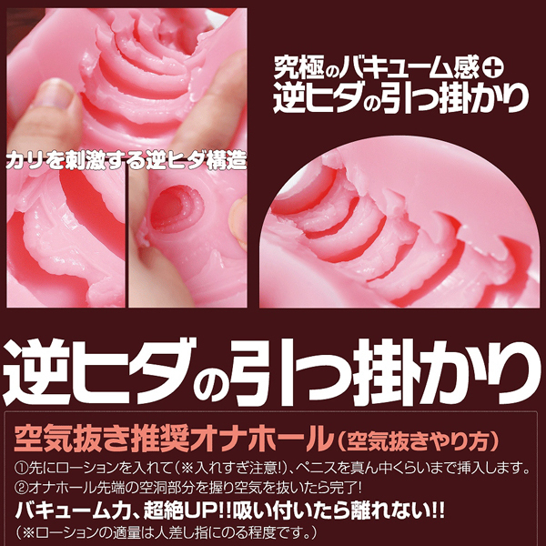 - 仕様非貫通型 パッケージ:20.5×13.5×7.5cm 本体:全長15.0cm 重量:300g 超強力バキュームと7連続する逆ヒダ構造が刺激する日本製の非貫通オナホ(国産ローション付属)。
