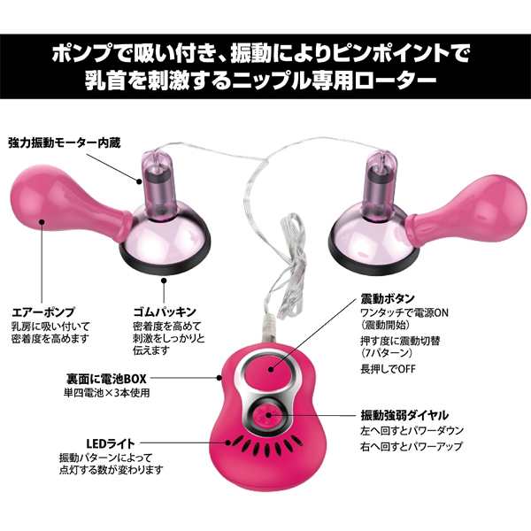 - 仕様パッケージ:16.5×20.0×5.2cm 本体:吸引部径4.9cm 電池:単四電池×3本使用 ポンプで吸い付き、縁についたゴムパッキンでピッタリ密着!7段階の振動で乳首をピンポイントに責め立てる電池式ニップルローター。