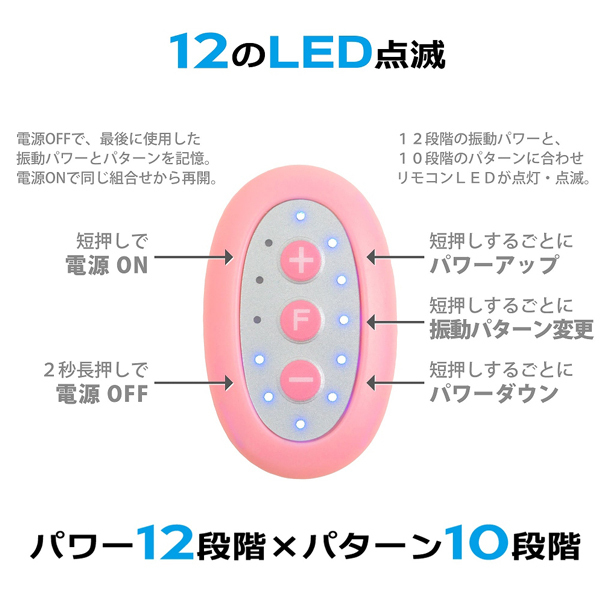 12段階のパワフル振動×10種類の振動パターンでおよそ120種もの快感による完全支配!リモコンにはパワーや振動が解りやすいLEDを12個を搭載、5分で自動的にOFFになる一時停止機能も完備しています。