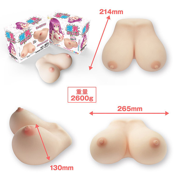 - 仕様パッケージ:30.5×24.0×13.0cm 本体:26.5×21.4×13.0cm 重量:2.6kg 重量2600gの特大サイズ!お椀型の超爆乳Gカップを見て触って挟んで楽しめるおっぱいグッズ(ローション付)。