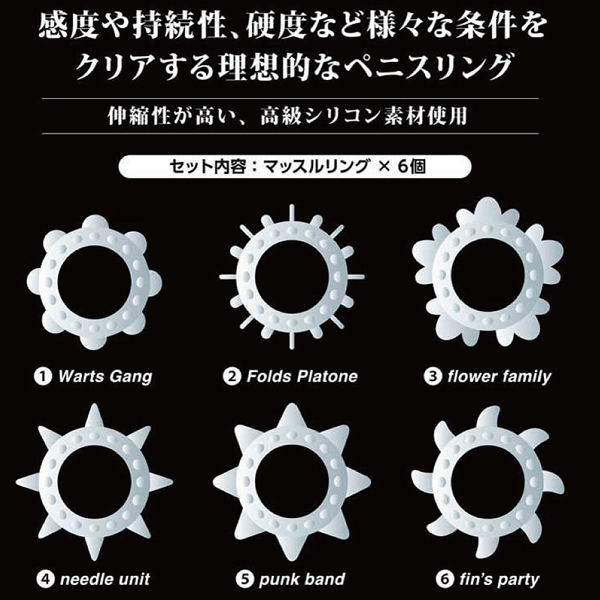 - 仕様パッケージ:14.5×102.×3.5cm 本体:内径1.6cm 6つの個性豊かな形状が楽しめる高級シリコン素材のペニスリング。
