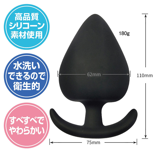 - 仕様パッケージ:14.0×6.0×7.4cm 本体:全長11.0cm・挿入部最大幅6.2cm 重量:180g 全長11cm、最大幅6.2cm!お尻の中を圧迫刺激する超特大180g仕様のストッパー付きプラグ。