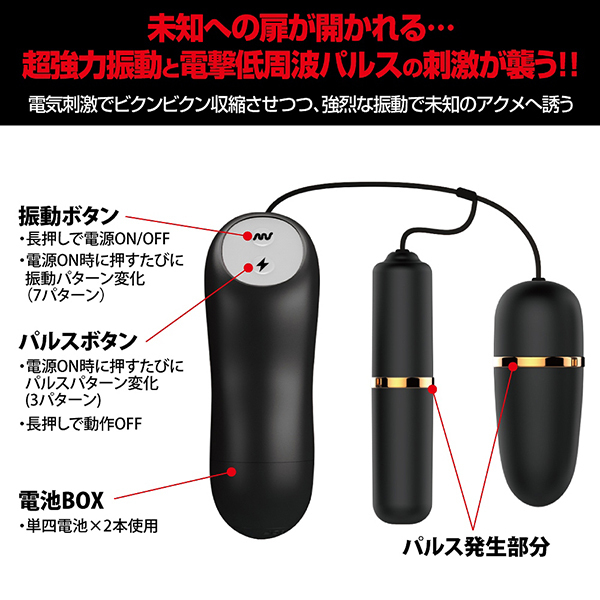 - 仕様パッケージ:13.5×10.0×4.2cm 本体:ローター太(6.5×2.6cm)・ローター細(7.5×1.8cm) 電池:単四電池×2本使用 未知への扉が開かれる…超強力振動と電撃低周波パルスの刺激が襲う!!電気刺激でビクンビクン収縮させつつ強烈な振動で未知のアクメへ誘う。