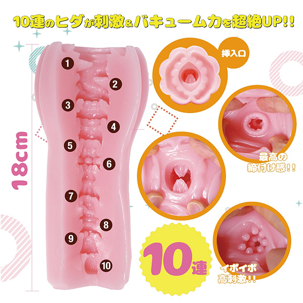 ロングサイズのオナホで個性的なヒダ形状が気持ちいい♪筒型のアウターはフロント部分に膨らみがあり、蕾のような感じでスリットが入っていたりと印象的!挿入口も独特で、くぱぁされたような個性的な形状を楽しみつつ、内部のイボリングがアクセントとなるキツ狭な最奥でイッちゃいます♪最奥付近では疑似子宮っぽい仕掛けが待ち受けており、全部で10連続するユニークなヒダを存分に堪能できる逸品となっています。