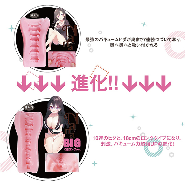 - 仕様非貫通型 パッケージ:20.5×13.5×7.5cm 本体:全長18.0cm・内部長17.0cm 重量:470g これまでにない新感覚!なんと10連続する逆テーパー型に配置された内部のヒダギミックが特徴の非貫通オナホ「NaNaBIG10連ロングver」です。