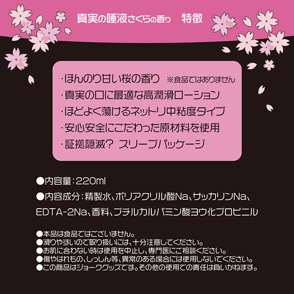 - 仕様ボトル:16.0×5.5×4.3cm ほどよくとろける感じでフェラホールとの相性がバツグンのローション「真実の唾液さくら」。