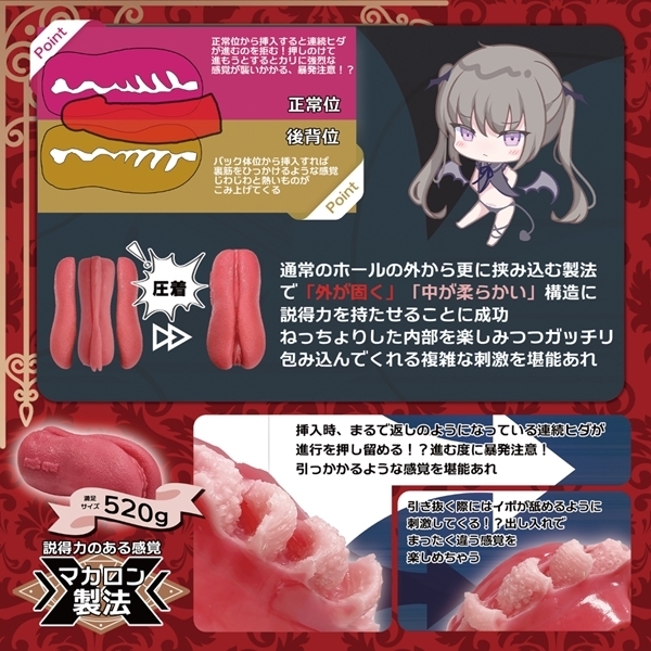 - 仕様非貫通型 パッケージ:23.0×13.5×9.0cm 本体:17.5×7.5×7.0cm 重量:520g 柔らかいオナホを外側から硬めの素材で圧着した非貫通オナホ「ハードカバーなトロトロ生膣マカロン」。