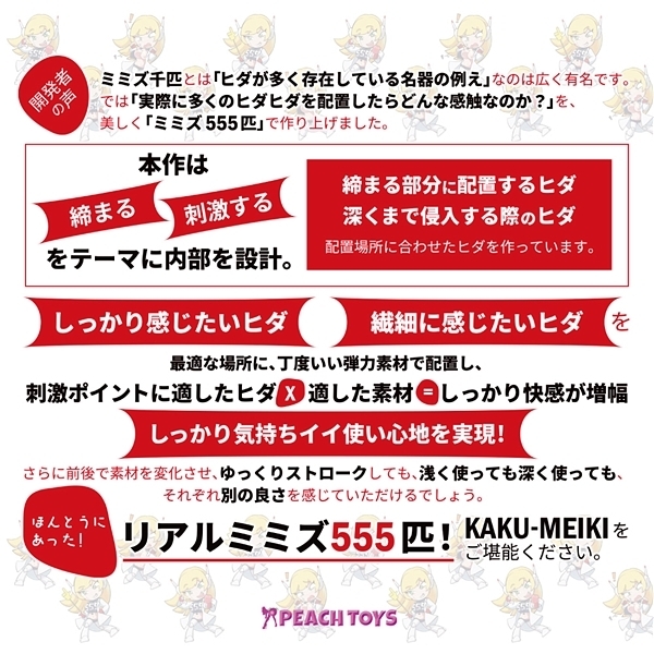 - 仕様非貫通型 パッケージ:20.0×9.0×11.0cm 本体 :18.0×8.2cm・内部長14.0cm 重量:500g 「締まる」「刺激する」をコンセプトに内部設計された、リアルに555本のヒダを配置した非貫通オナホ「KAKU−MEIKI MIMIZU555」です。