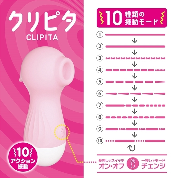 - 仕様パッケージ:11.0×7.0×3.8cm 本体:9.8×3.8×4.5cm USB充電式 吸い付いて震えるクリピタは、シリコン素材で柔らかい触感とケーブルレスで簡単充電が特徴の吸引グッズ。