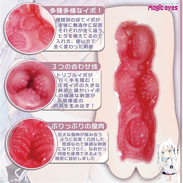 入口部、中段部、最深部にそれぞれ方向とテクスチャーの違うぼてイボを各3つ配置したことにより様々な使用感を味わえます。