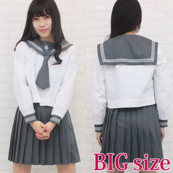 - 仕様BIGサイズ:B114cm程度・W〜86cm 丈:上着53cm(袖丈60cm)・肩幅45cm・スカート48cm セット内容:上着(横ファスナー、袖・襟に3本ライン入り(白色)、胸当てに校章入り(白色)、胸ポケット付き)・スカート(横ファスナー、アジャスター有り)・スカーフ グレー×白の色使いが珍しい、セーラー服コスチューム。