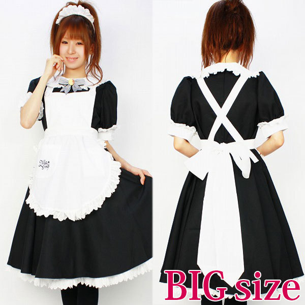 - 仕様BIGサイズ:B92〜100cm・W78〜84cm 丈:ワンピース108cm(袖丈30cm)・ペチコート67cm セット内容:ワンピース(後ろファスナー、袖パフスリーブ、袖、襟繰りにレース付)・エプロン(肩紐下部にボタン付、ポケット付)・ペチコート(裾レース付、ウェストゴム仕様)・カチューシャ(全フリル)・ブローチ(安全ピン付)・メイドキャップ(クリップ付) メイドカフェで実際に着用される、膝下ロング丈の本格メイド制服(BIG)です。