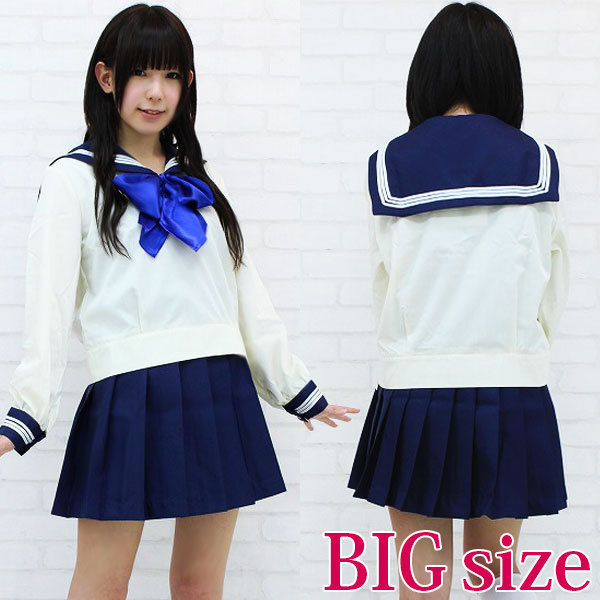 - 仕様BIGサイズ:B90〜104cm・W78〜86cm 上着(着丈57cm・肩幅41cm・袖丈58cm)・スカート48cm・スカーフ154cm セット内容:上着(サイドファスナー・胸ポケット付き)・スカート(サイドファスナー、アジャスター調節可)・リボン(上着一体型) 青いリボンが爽やか!キュートな長袖セーラー服コスプレ。