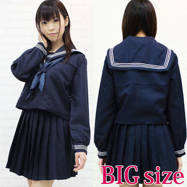 - 仕様BIGサイズ:B88〜110cm・W〜86cm 丈:上着55cm(袖丈61cm、肩幅44cm)・スカート48cm セット内容:上着(サイドファスナー)・スカート(アジャスター調節可)・スカーフ 制服コスプレの定番!ネイビーカラーの長袖セーラー服。