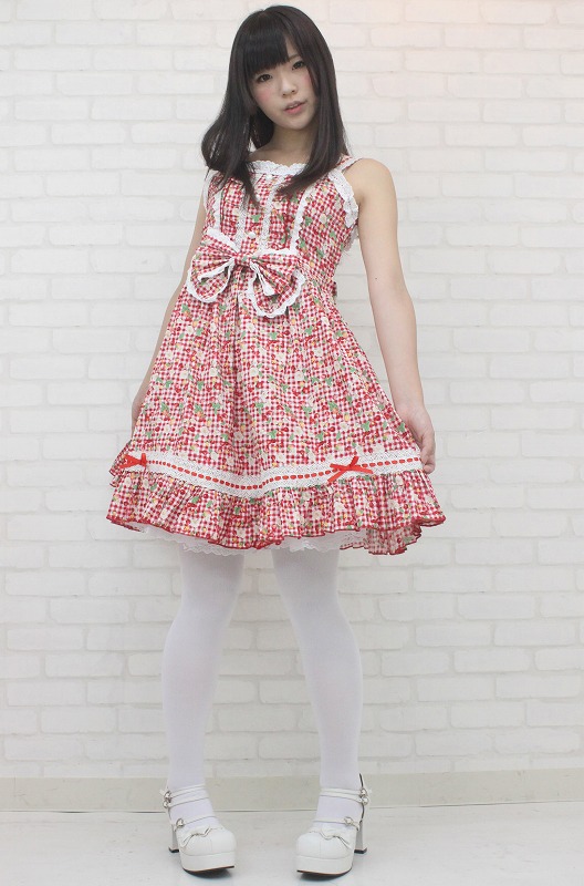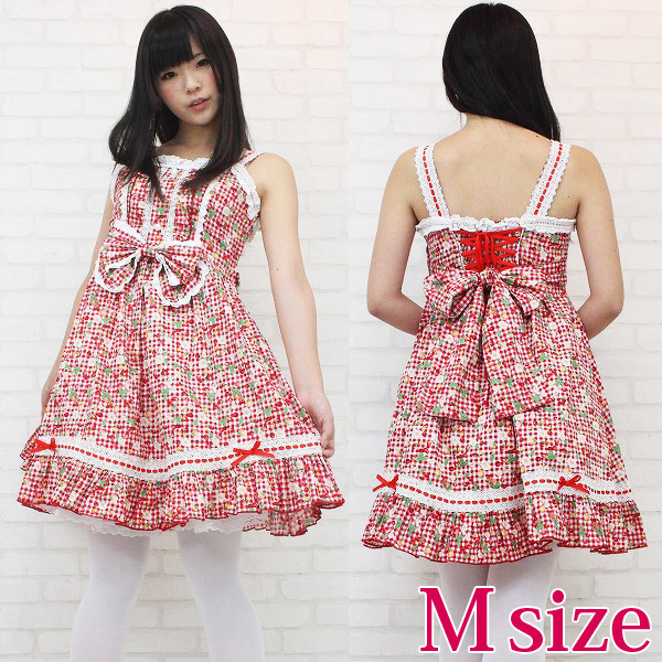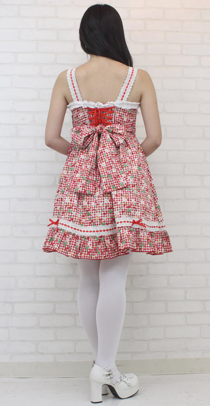 - 仕様Mサイズ:B78〜86cm・W62〜80cm セット内容:ジャンパースカート(横ファスナー、後ろ編み上げシャーリング、前飾りボタン)・リボン(ピンにて取り外し可) 真っ赤なチェリー&ベリーでキュートに仕上げた、ギンガムチェックのジャンパースカート(M)。