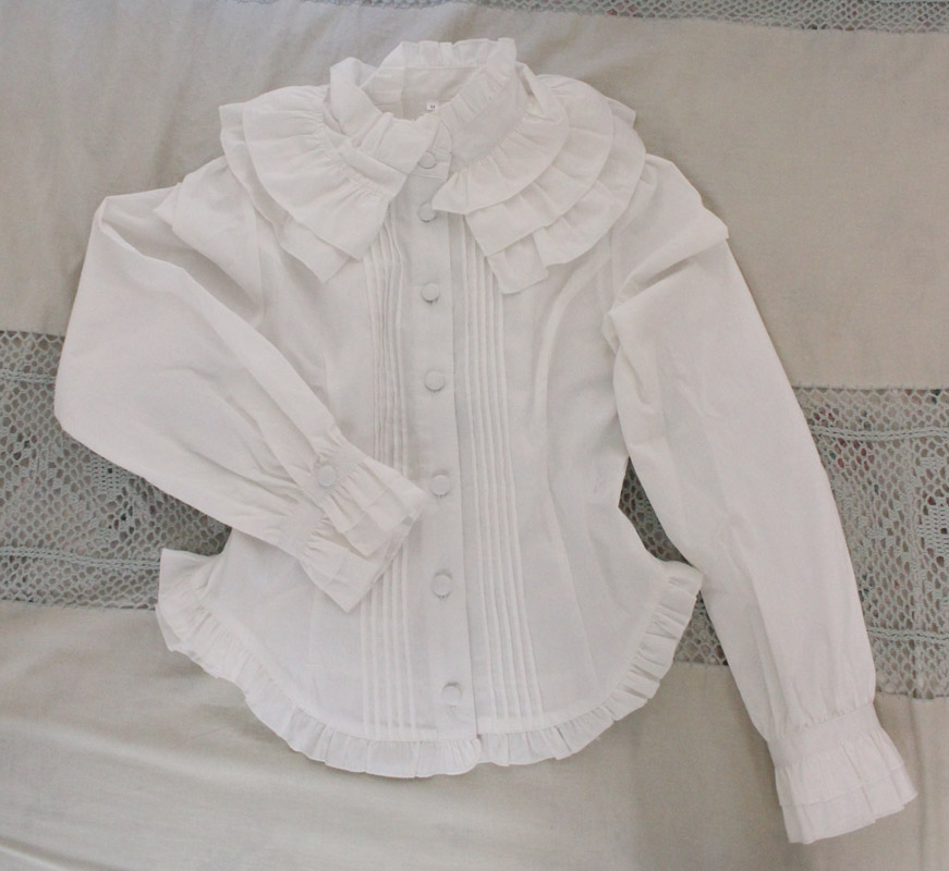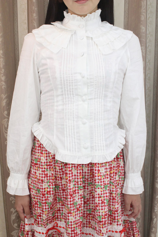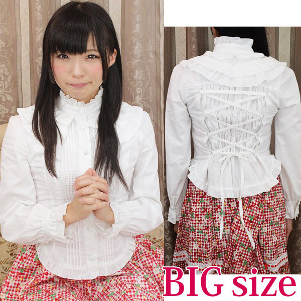 立襟のフリルがとっても可愛く、肌触りが良いので着心地も良好!バックはシャーリング入りの編み上げになっており、ゴスロリやコスプレ衣装とも相性抜群!一枚は持っておきたいキュートなブラウスです。
