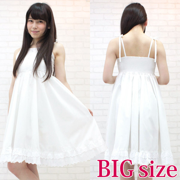 - 仕様BIGサイズ:B88〜106cm・W68〜100cm 丈:ワンピース(肩紐を抜き)92cm(肩紐前35cm、肩紐後53cm) セット内容:ワンピース単品(背面シャーリング入り、肩紐調節可能) 夏のよそいき、お出かけスタイル!BIGサイズでも超可愛い、ホワイトワンピース。