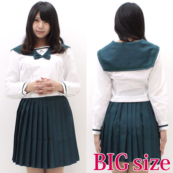 - 仕様BIGサイズ:B88〜106cm・W〜86cm 着丈:上衣50cm(袖丈60cm、肩幅45cm) スカート丈:48cm セット内容:上衣(前ファスナー)、スカート(アジャスター調整可)、リボン(スナップボタンにて取り外し可) 素材:ポリエステル100% 黒でも紺でもない落ち着いた緑色が新鮮!白い部分とのコントラストが映えるセーラー服。