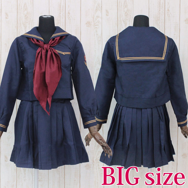 - 仕様BIGサイズ:B85〜110cm・W76〜88cm 上衣:着丈51cm・袖丈57cm・肩幅46cm スカート:着丈45cm セット内容:上衣(フロントホック)、スカート(三段ホック)、スカーフ 素材:ポリエステル100% あの有名な女学院の冬制服に、男性でも着られるBIGサイズが登場しました!真っ赤な長いスカーフに、丈の長いプリーツスカートがポイント。