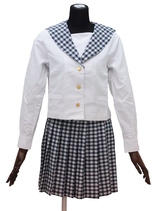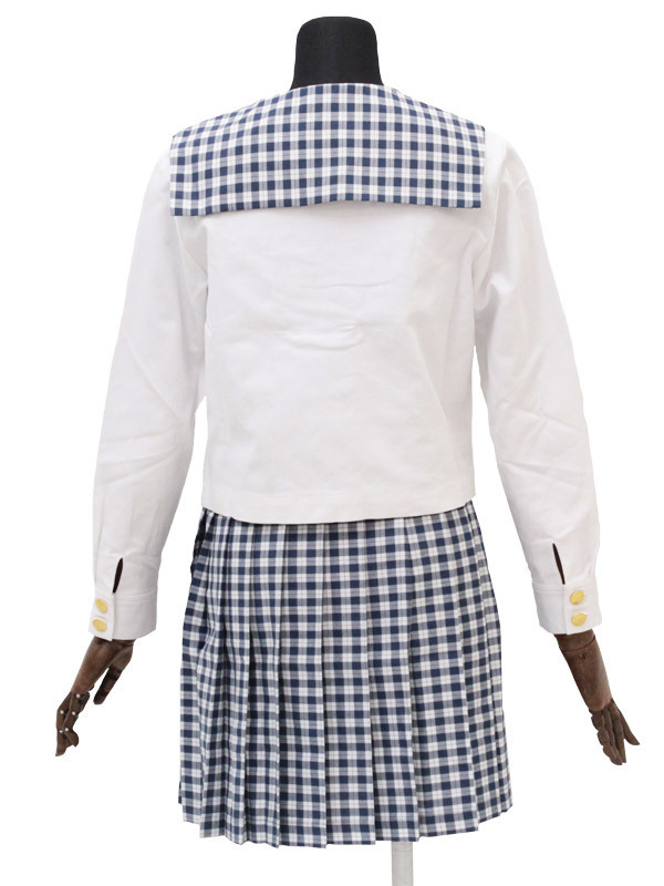 - 仕様BIGサイズ:B88〜104cm・W76〜85cm 上衣:着丈52cm 袖丈61m 肩幅44cm スカート丈47cm セット内容:上衣(前ボタン・首元スナップボタンあり・手首ボタンあり、スカート(アジャスターにより調節可) 素材:ポリエステル100% フロントと袖口の金ボタンがポイント!紺色ギンガムチェックのセーラー服コスプレ。