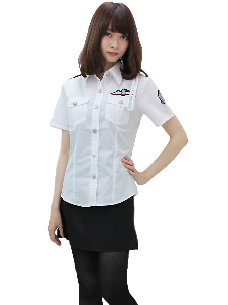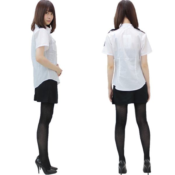 ボディラインに寄り添う美シルエットの白シャツと、短め丈のタイトスカートでセクシーに決まる婦人警官のコスプレ衣装です。