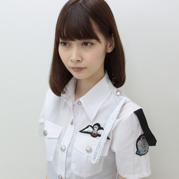 ●ラウンドテイルの白シャツ●ワッペン&肩ロープ付き●スリット入りの黒タイトスカート。
