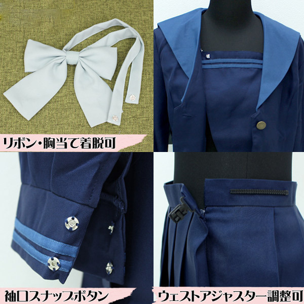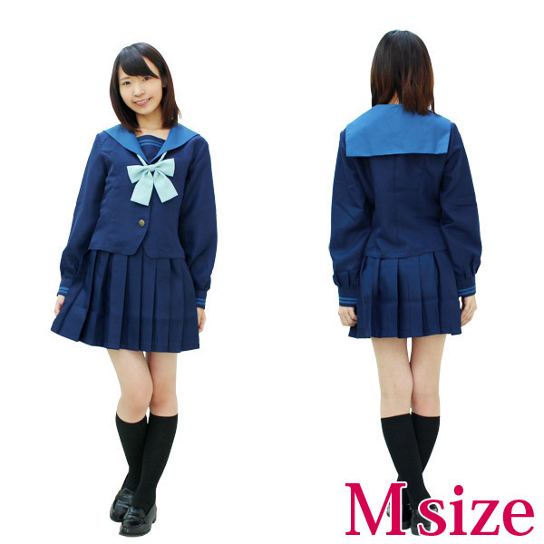 - 仕様Mサイズ:B〜94cm・W〜73cm 上衣:着丈51cm・肩幅40cm・袖丈58cm・袖口21cm スカート丈約40cm セット内容:上衣(前開きボタン留め、袖口スナップボタン留め、胸当てとリボンはスナップボタンで着脱可)、スカート(ウェスト部分アジャスター調整可)、リボン 素材:ポリエステル100% 学生らしいさわやかなブルー系♪襟の色が特徴的な人気の旧冬服セーラー服(Mサイズ)。