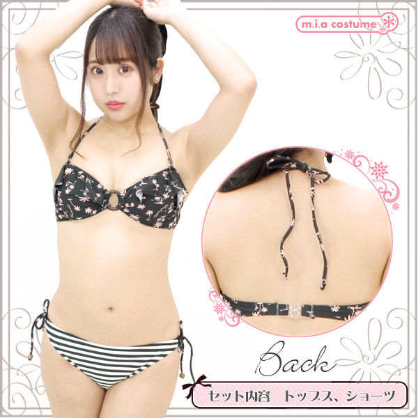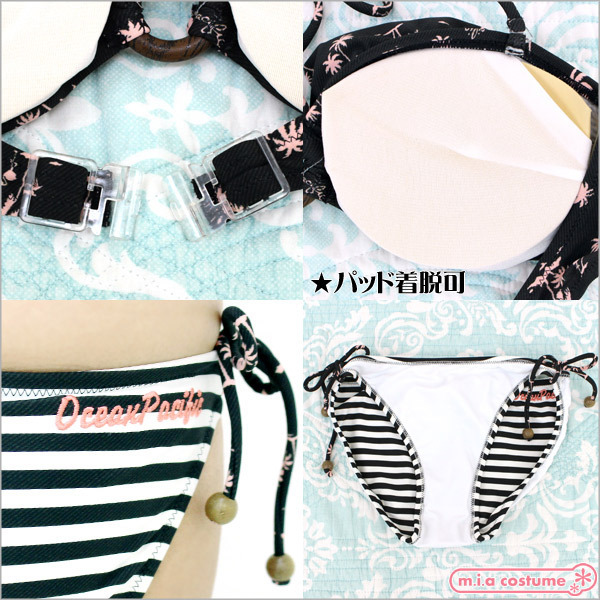 - 仕様9Mサイズ:B83cm・H87〜95cm セット内容:トップス(パッド着脱可、ワイヤー無し)、ビキニショーツ 素材:ポリエステル85%、ポリウレタン15% 生産国:日本 ヤシの木や赤白ボーダーのマリン柄が夏気分高める可愛い日本製のビキニ水着。