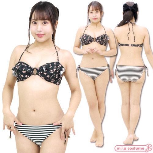 海やプールなどのレジャーシーンで大活躍すること間違いなし!元気で健康的なデザインに、フリルで可愛さをプラスしたホルターネック仕様のブラ&ビキニショーツの2点セットです♪