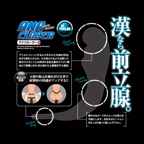 - 仕様パッケージ:13.0×16.0×4.0cm 本体:10.0×2.8〜3.7cm・リング内径2.5cm 漢なら黙って前立腺マッサージ!前立腺刺激に特化したソフト素材のアナルグッズ「アナクローザー TYPE.03」。